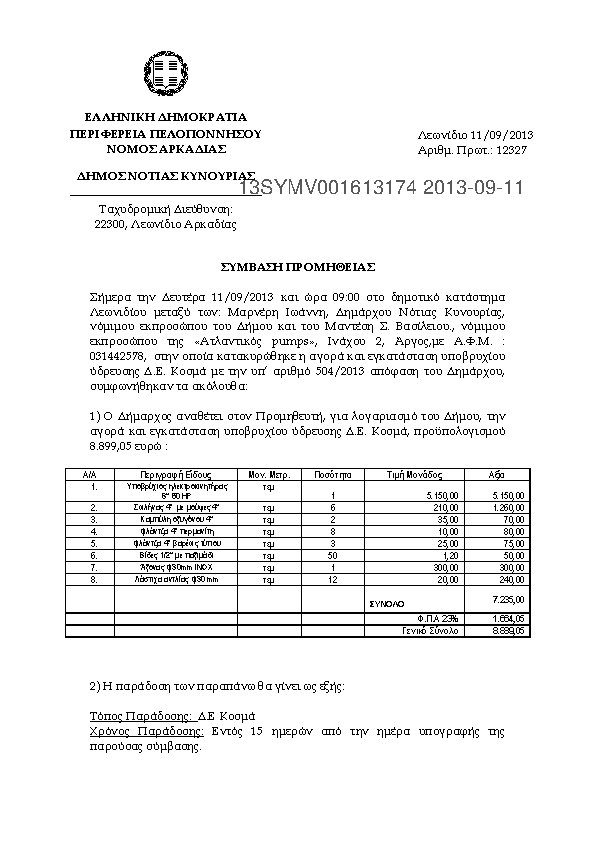 7. Σύμβαση αγοράς και εγκατάστασης υποβρυχίου ύδρευσης Δ.Ε. Κοσμά