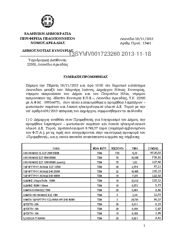 1. Σύμβαση προμήθειας και τοποθέτησης φωτιστικών στην Τ.Κ. Πηγαδίου