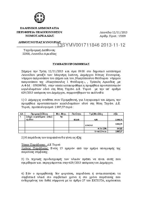 3. Σύμβαση προμήθειας προστατευτικών κιγκλιδωμάτων οδού στη θέση Τηγάνι Δ.Ε. Τυρού
