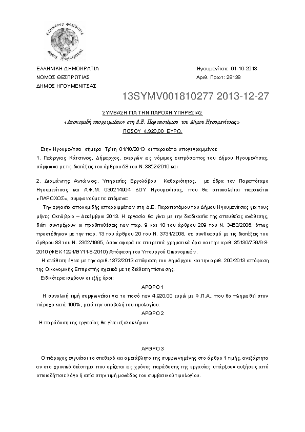 1. Αποκομιδή απορριμμάτων στη Δ.Ε. Παραποτάμου του Δήμου Ηγουμενίτσας.