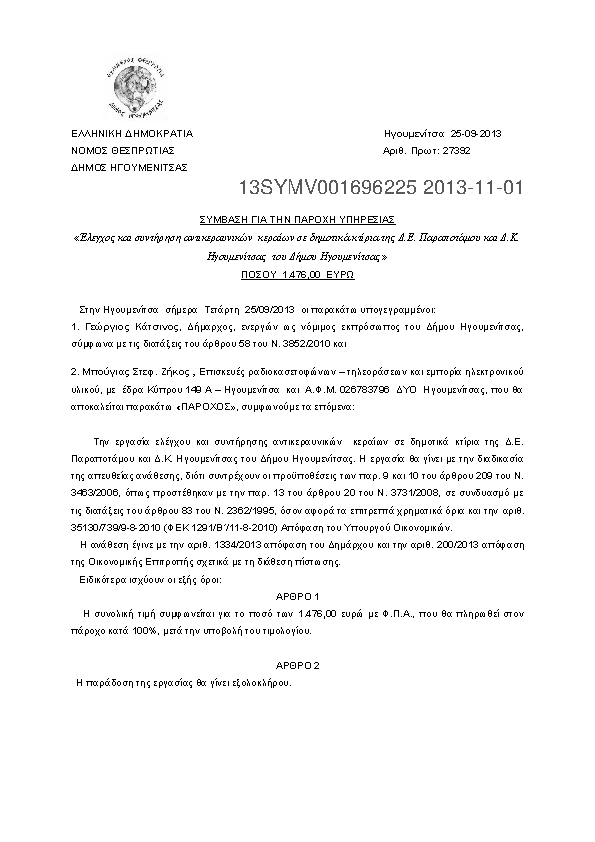 6. Έλεγχος και συντήρηση αντικεραυνικών κεραίων σε δημοτικά κτίρια της ΔΕ Παραποτάμου και ΔΚ Ηγ/τσας.