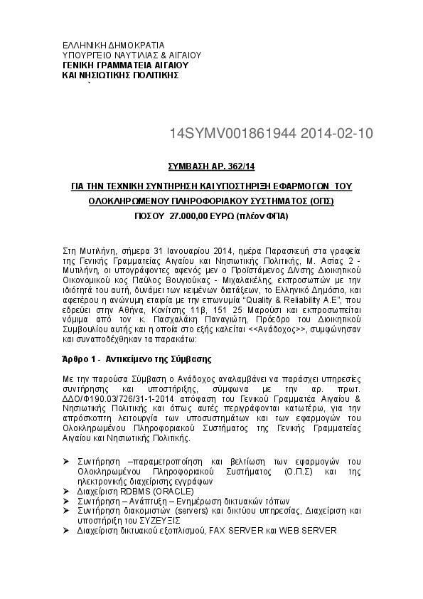 1. ΣΥΜΒΑΣΗ ΓΙΑ ΤΗΝ ΤΕΧΝΙΚΗ ΣΥΝΤΗΡΗΣΗ ΚΑΙ ΥΠΟΣΤΗΡΙΞΗ ΕΦΑΡΜΟΓΩΝ ΤΟΥ ΟΛΟΚΛΗΡΩΜΕΝΟΥ ΠΛΗΡΟΦΟΡΙΑΚΟΥ ΣΥΣΤΗΜΑΤ