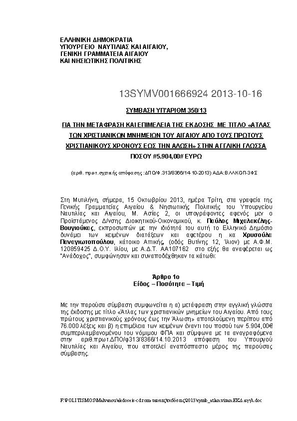 6. Σύμβαση για την μετάφραση & επιμέλεια της έκδοσης με τίτλο "Ατλας των Χριστιανικών Μνημείων του Αιγα