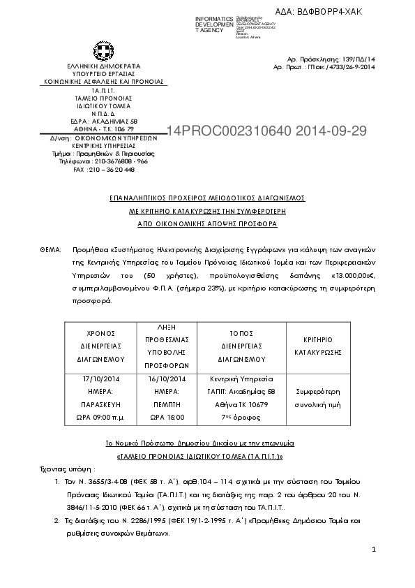 2. Προμήθεια «Συστήματος Ηλεκτρονικής Διαχείρισης Εγγράφων» για κάλυψη των αναγκών της Κεντρικής Υπηρεσ