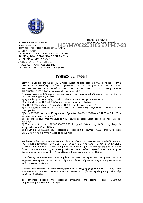 1. ΣΥΝΔΕΣΗ ΜΕ ΤΟ ΔΙΚΤΥΟ ΦΥΣΙΚΟΥ ΑΕΡΙΟΥ ΣΤΟ ΚΛΕΙΣΤΟ ΓΥΜΝΑΣΤΗΡΙΟ ΝΕΑΣ ΙΩΝΙΑΣ