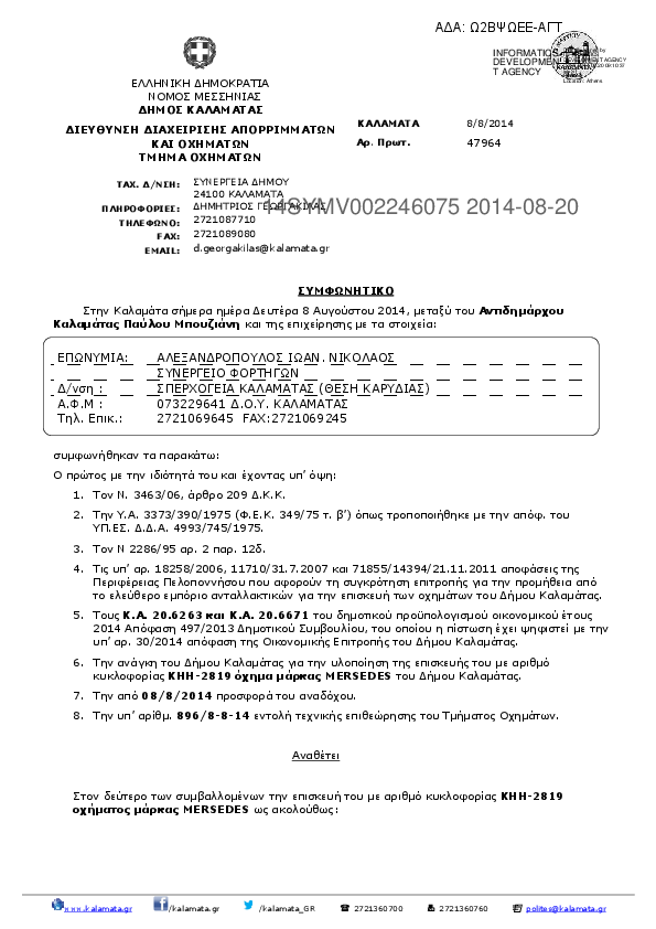 7. ΣΥΜΦΩΝΗΤΙΚΟ ΓΙΑ ΤΗΝ ΕΠΙΣΚΕΥΗ ΤΟΥ ΥΠ' ΑΡΙΘ. ΚΗΗ 2819 ΟΧΗΜΑΤΟΣ ΜΑΡΚΑΣ MERCEDES ΤΟΥ ΔΗΜΟΥ ΚΑΛΑΜΑΤΑΣ