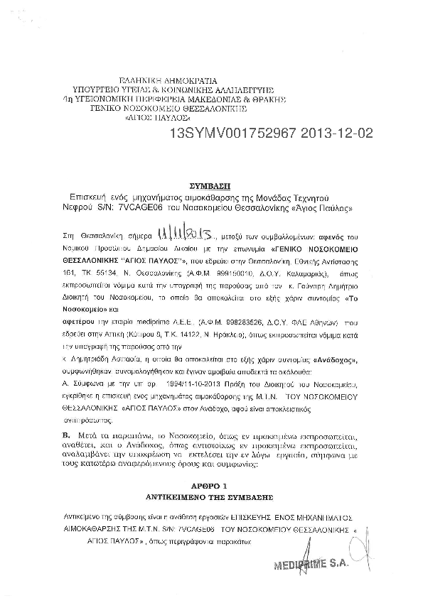 1. ΕΠΙΣΚΕΥΗ ΜΗΧΑΝΗΜΑΤΟΣ ΑΙΜΟΚΑΘΑΡΣΗΣ