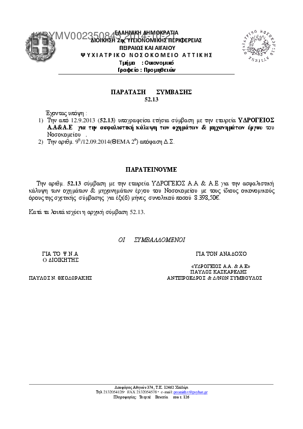 3. ΠΑΡΑΤΑΣΗ ΣΥΜΒΑΣΗΣ ΑΡΙΘΜ. 52.13 ΓΙΑ ΤΗΝ ΑΣΦΑΛΙΣΤΙΚΗ ΚΑΛΥΨΗ ΤΩΝ ΟΧΗΜΑΤΩΝ -Ψ.Ν.Α.