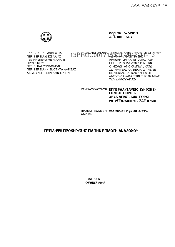 5. ΠΕΡΙΛΗΨΗ ΠΡΟΚΗΡΥΞΗΣ ΓΙΑ ΤΗΝ ΕΠΙΛΟΓΗ ΑΝΑΔΟΧΟΥ TOY ΕΡΓΟΥ: ΤΕΧΝΙΚΟΣ ΣΥΜΒΟΥΛΟΣ ΤΟΥ ΕΡΓΟΥ: «ΔΙΚΤΥΑ ΑΠΟΧΕΤΕΥΣΗΣ ΑΚΑΘΑΡΤΩΝ ΚΑΙ ΕΓΚΑΤΑΣΤΑΣΗ ΕΠΕΞΕΡΓΑΣΙΑΣ ΛΥΜΑΤΩΝ ΤΩΝ ΟΙΚΙΣΜΩΝ ΑΓΙΟΚΑΜΠΟΥ, ΚΑΤΩ ΣΩΤΗΡΙΤΣΑΣ ΚΑΙ ΒΕΛΙΚΑΣ ΤΗΣ ΔΕ ΜΕΛΙΒΟΙΑΣ ΚΑΙ ΟΛΟΚΛΗΡΩΣΗ...