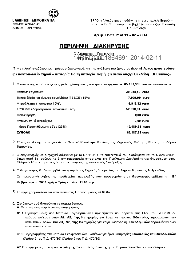3. ΠΕΡΙΛΗΨΗ ΔΙΑΚΗΡΥΞΗΣ: "Πλακόστρωση οδών: (α) παντοπωλείο Ξηρού – πιτσαρία Γιαβή πιτσαρία Γιαβή, (β) στενό ουζερί Ευκλείδη Τ.Κ.Βυτίνας"