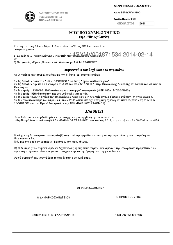 1. Συμφωνητικό για ΄΄Προμήθεια τροφίμων (ΚΑΠΗ ΠΑΙΔΙΚΟΣ ΣΤΑΘΜΟΣ ) για το έτος 2014