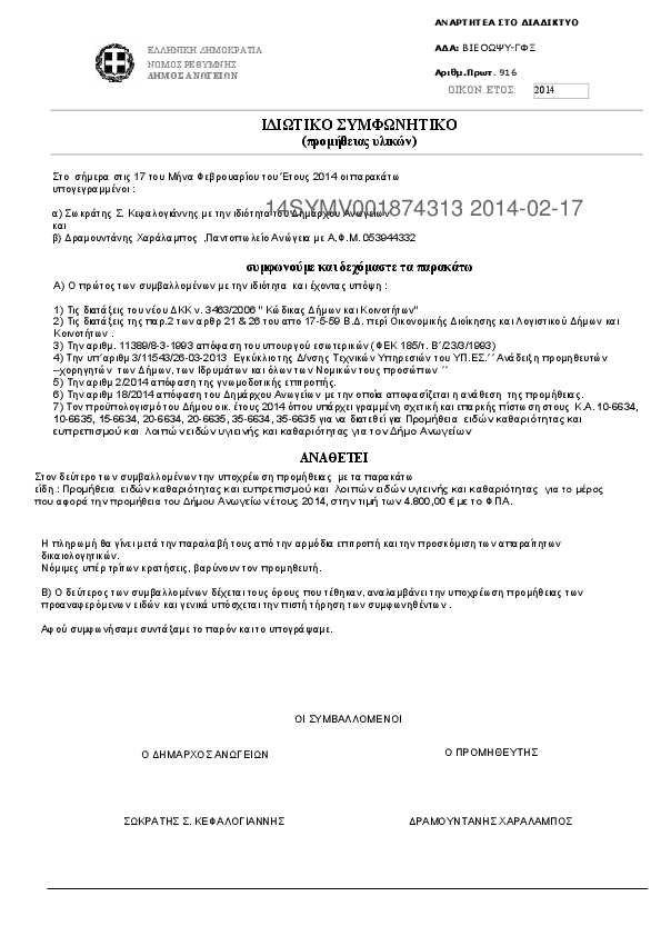 2. Συμφωνητικό ΄΄Προμήθειας ειδών καθαριότητας για το μέρος που αφορά το Δήμο Ανωγείων έτους 2014