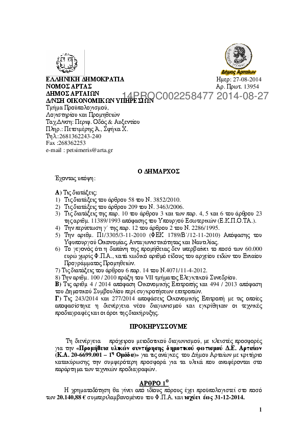 8. ΠΡΟΧΕΙΡΟΣ ΔΙΑΓΩΝΙΣΜΟΣ ΓΙΑ ΤΗΝ Προμήθεια υλικών συντήρησης δημοτικού φωτισμού Δ.Ε. Αρταίων (Κ.Α. 20-6