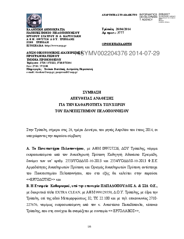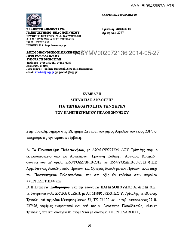 1. ΣΥΜΒΑΣΗ ΑΠΕΥΘΕΙΑΣ ΑΝΑΘΕΣΗΣ ΓΙΑ ΤΗΝ ΚΑΘΑΡΙΟΤΗΤΑ ΤΩΝ ΧΩΡΩΝ ΤΟΥ ΠΑΝΕΠΙΣΤΗΜΙΟΥ ΠΕΛΟΠΟΝΝΗΣΟΥ