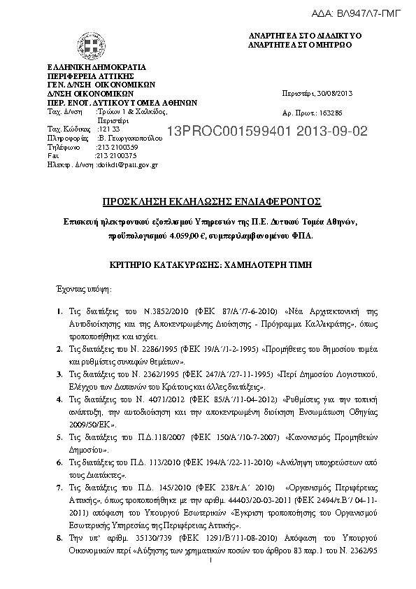 1. Πρόσκληση Εκδήλωσης Ενδιαφέροντος για επισκευή ηλεκτρονικού εξοπλισμού Υπηρεσιών της Π.Ε. Δυτικού Τομέα Αθηνών