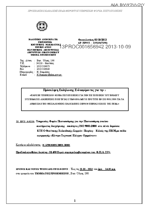 4. Πρόσκληση Εκδήλωσης Ενδιαφέροντος για την : «ΠΑΡΟΧΗ ΥΠΗΡΕΣΙΩΝ ΤΕΧΝΙΚΟΥ ΣΥΜΒΟΥΛΟΥ ΓΙΑ ΤΗΝ ΑΝΑΠΤΥΞΗ ΕΝΙΑΙΟΥ ΣΥΣΤΗΜΑΤΟΣ ΔΙΑΧΕΙΡΙΣΗΣ ΠΟΙΟΤΗΤΑΣ ΣΥΜΦΩΝΑ ΜΕ ΤΟ ΠΡΟΤΥΠΟ ΕΝ ISO 9001:2008 ΓΙΑ ΤΑ ΔΗΜΟΣΙΑ ΚΤΕΟ ΘΕΣΣΑΛΟΝΙΚΗΣ