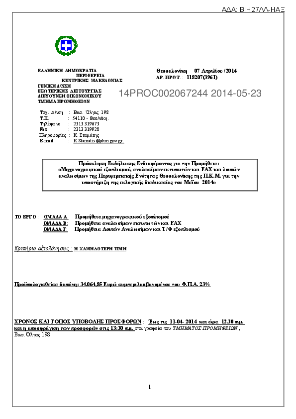 8. Πρόσκληση Εκδήλωσης Ενδιαφέροντος για την Προμήθεια:«Μηχανογραφικού εξοπλισμού, αναλωσίμων εκτυπωτών και FAX και λοιπών αναλωσίμων της Περιφερειακής Ενότητας Θεσσαλονίκης της Π.Κ.Μ. για την υποστήριξη της εκλογικής διαδικασίας του Μαΐου ...