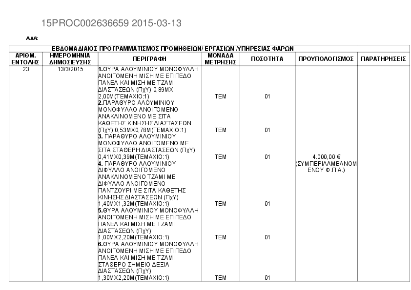 4. Διακήρυξη Πρόχειρου Μειοδοτικού Διαγωνισμού υπ’ αρίθμ. 31/2015 για την Προμήθεια και Εγκατάσταση Μία
