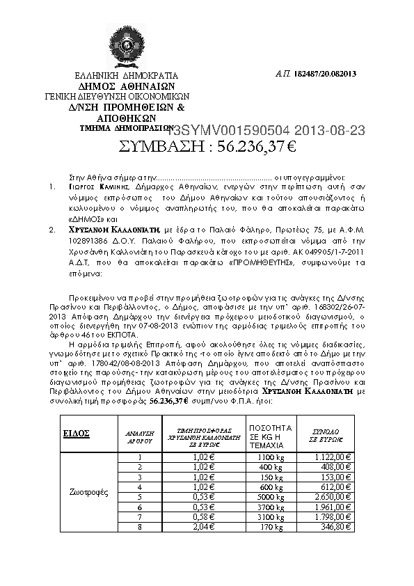 8. ΣΥΜΒΑΣΗ ΓΙΑ ΤΗΝ ΠΡΟΜΗΘΕΙΑ ΖΩΟΤΡΟΦΩΝ ΓΙΑ ΤΙΣ ΑΝΑΓΚΕΣ ΤΗΣ Δ/ΝΣΗΣ ΠΡΑΣΙΝΟΥ & ΠΕΡΙΒΑΛΛΟΝΤΟΣ