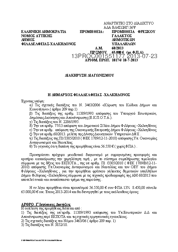 3. ΔΙΑΚΗΡΥΞΗ ΔΙΑΓΩΝΙΣΜΟΥ ΜΕ ΘΕΜΑ ΤΗΝ ΠΡΟΜΗΘΕΙΑ ΦΡΕΣΚΟΥ ΓΑΛΑΚΤΟΣ ΔΗΜΟΤΙΚΩΝ ΥΠΑΛΛΗΛΩΝ (Α.Μ.68/2013)
