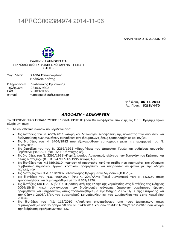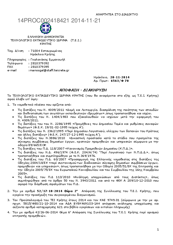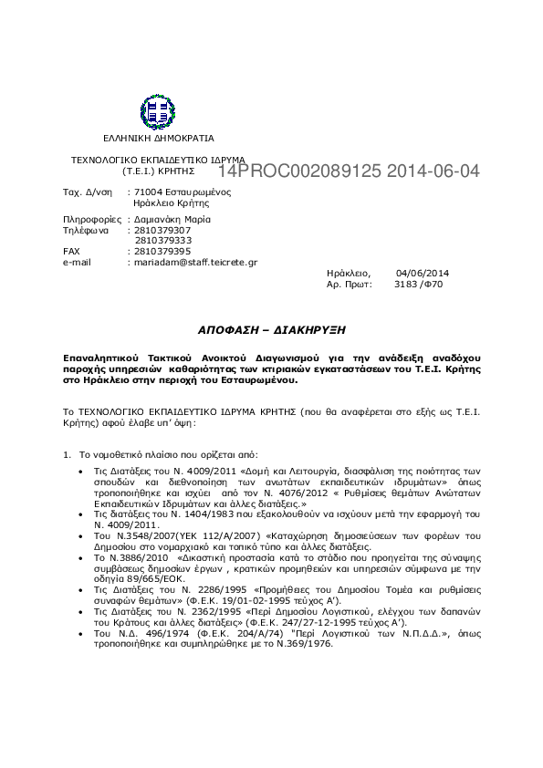 1. Σύμβαση παροχής υπηρεσιών καθαριότητας των κτιριων του ΤΕΙ Κρήτης στη Σητεία