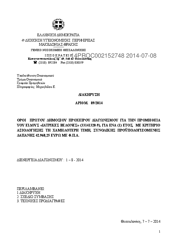 3. ΠΡΟΧΕΙΡΟΣ ΔΙΑΓΩΝΙΣΜΟΣ ΓΙΑ ΠΡΟΜΗΘΕΙΑ "ΙΑΤΡΙΚΩΝ ΒΕΛΟΝΩΝ" ΓΙΑ 1 ΕΤΟΣ