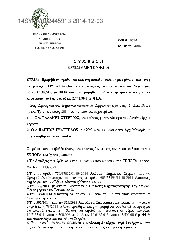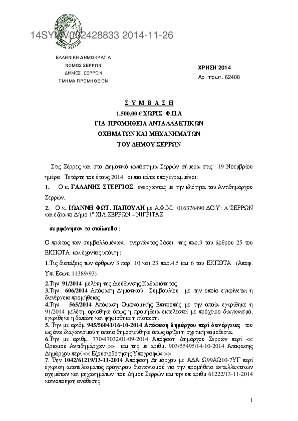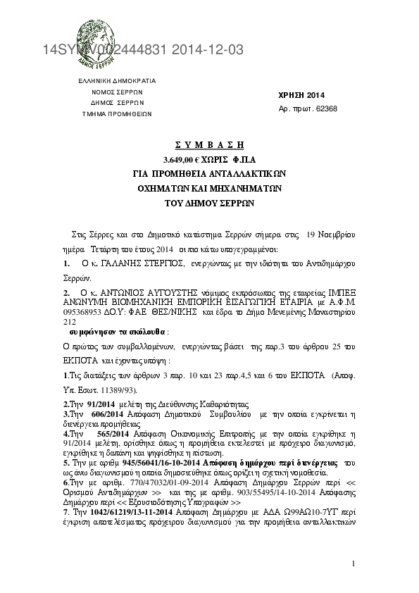 1. ΓΙΑ ΠΡΟΜΗΘΕΙΑ ΑΝΤΑΛΛΑΚΤΙΚΩΝ ΟΧΗΜΑΤΩΝ ΚΑΙ ΜΗΧΑΝΗΜΑΤΩΝ ΤΟΥ ΔΗΜΟΥ ΣΕΡΡΩΝ