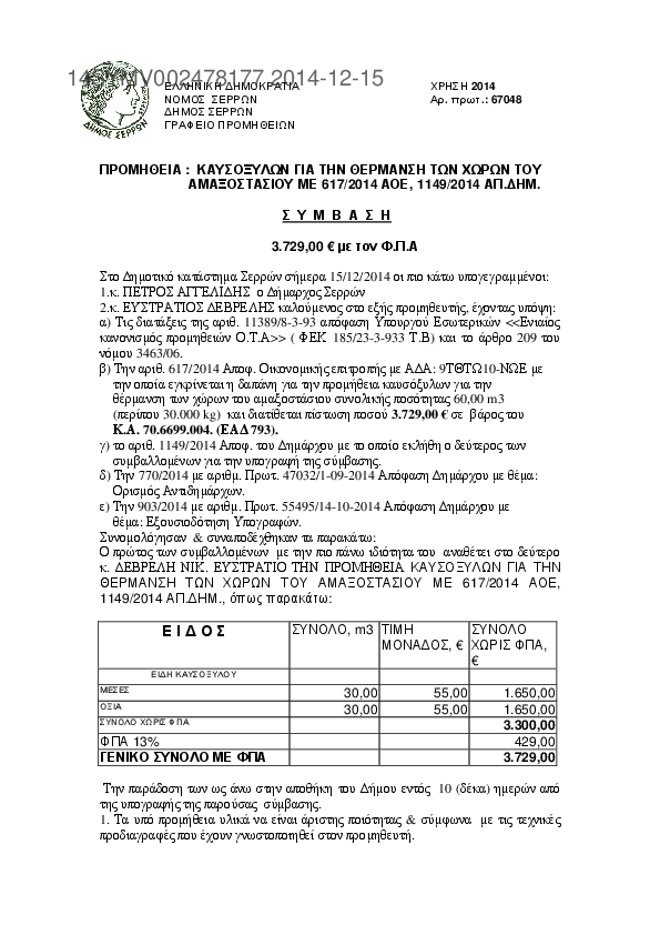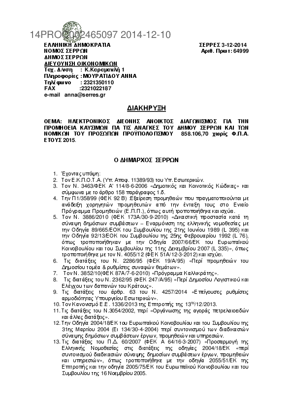 4. ΔΙΑΚΗΡΥΞΗ ΗΛΕΚΤΡΟΝΙΚΟΥ ΔΙΕΘΝΗ ΑΝΟΙΚΤΟΥ ΔΙΑΓΩΝΙΣΜΟΥ ΓΙΑ ΤΗΝ ΠΡΟΜΗΘΕΙΑ ΚΑΥΣΙΜΩΝ ΓΙΑ ΤΙΣ ΑΝΑΓΚΕΣ ΤΟΥ ΔΗΜΟΥ ΣΕΡΡΩΝ ΚΑΙ ΤΩΝ ΝΟΜΙΚΩΝ ΤΟΥ ΠΡΟΣΩΠΩΝ ΠΡΟΫΠΟΛΟΓΙΣΜΟΥ 858.106,70 χωρίς Φ.Π.Α. ΕΤΟΥΣ 2015 .