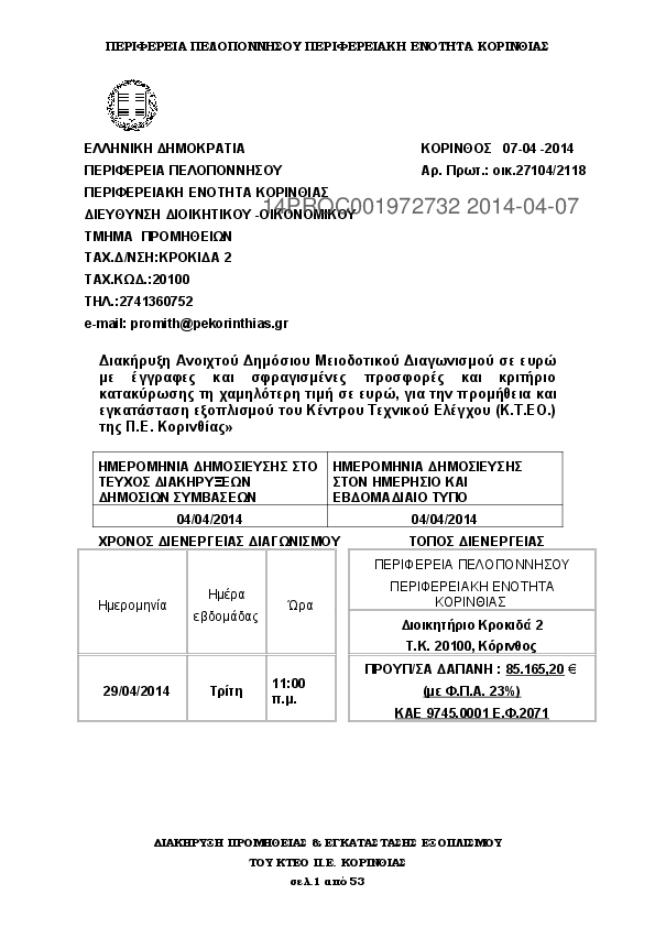 9. Δημοσίευση περίληψης Προκήρυξης Ανοικτού Δημόσιου Διαγωνισμού επιλογής αναδόχου του έργου «Προμήθεια και εγκατάσταση εξοπλισμού του Κέντρου Τεχνικού Ελέγχου (Κ.Τ.ΕΟ.) της Π.Ε. Κορινθίας