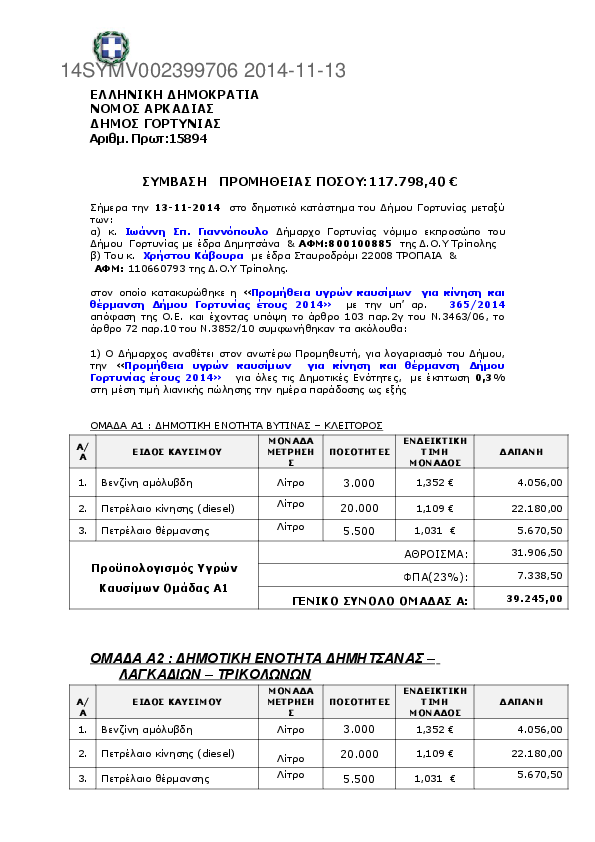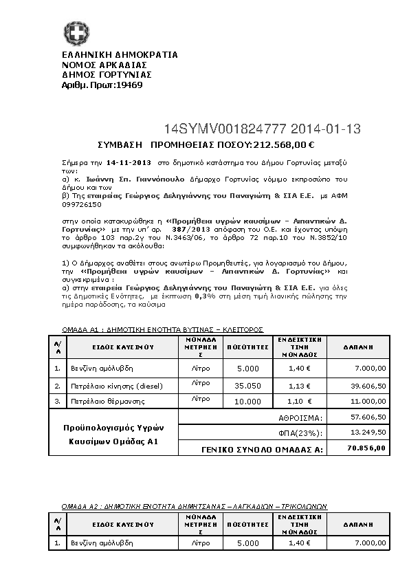 10. Προμήθεια υγρών καυσίμων για κίνηση και θέρμανση Δήμου Γορτυνίας έτους 2014