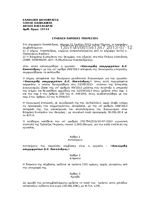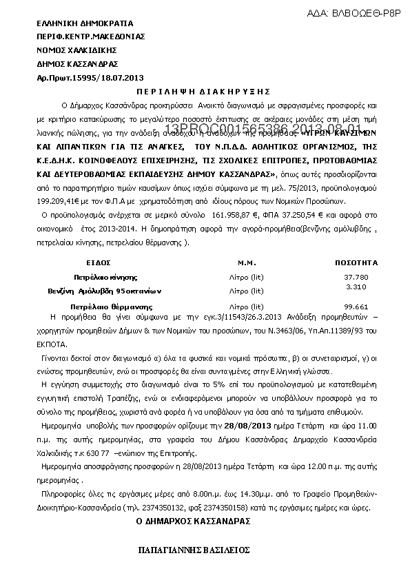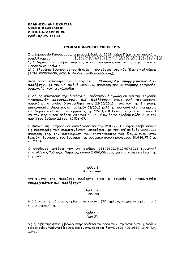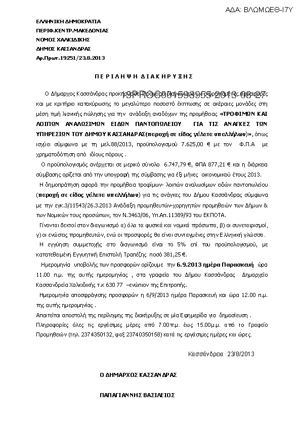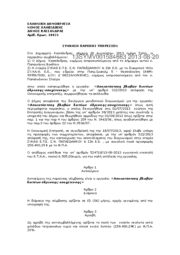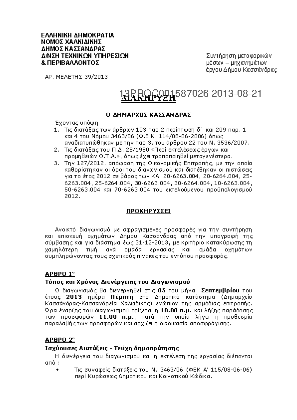 1. Περίληψη διακήρυξης της παροχής υπηρεσιών «Επισκευή και Συντήρηση μεταφορικών μέσων και μηχανημάτων έργου Δήμου Κασσάνδρας»