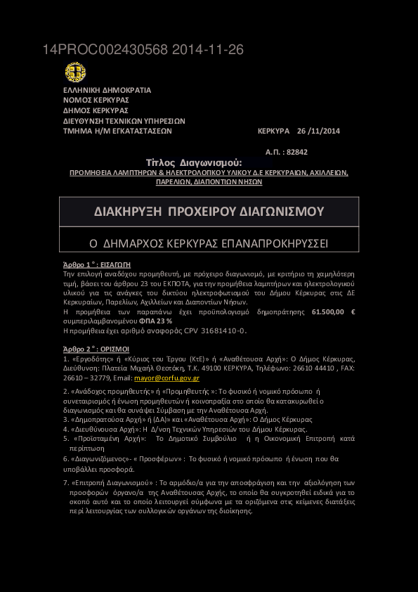7. Ο Δήμαρχος Κέρκυρας επαναπροκηρύσσει δημόσιο πρόχειρο διαγωνισμό με γραπτές προσφορές με κριτήριο κατακύρωσης την χαμηλότερη τιμή για την : « Προμήθεια λαμπτήρων και ηλεκτρολογικού υλικού για τις ανάγκες του δικτύου ηλεκτροφωτισμού του Δ...
