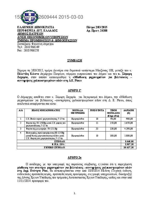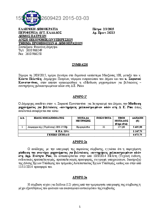 9. Μίσθωση μηχανημάτων για βελτιώσεις - συντηρήσεις χαλικοστρωμένων οδών στη Δ.Ε. Μεσσάτιδος Δ. Πατρέων