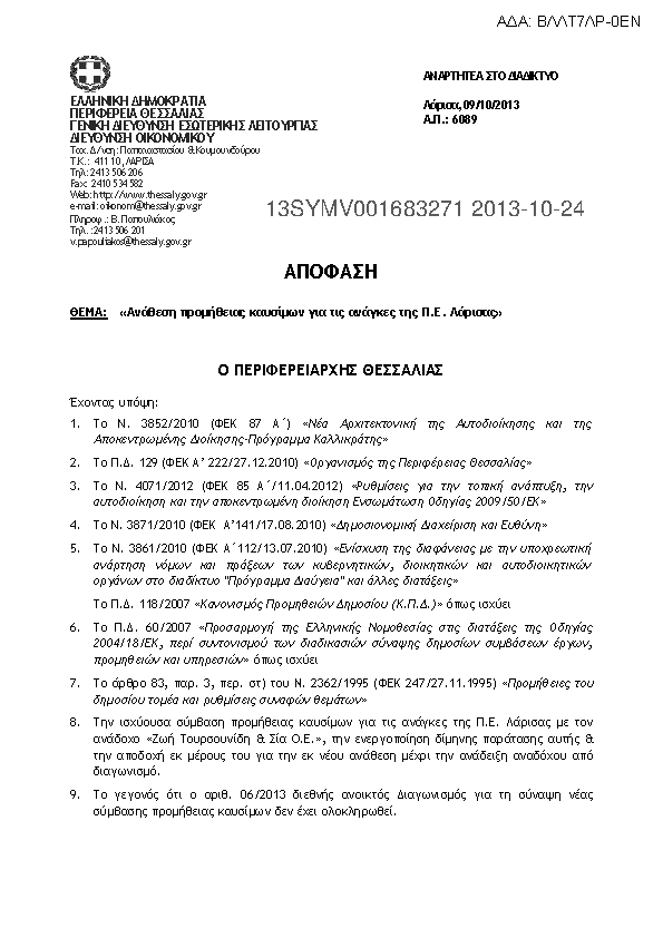 6. Ανάθεση προμήθειας καυσίμων για τις ανάγκες της Π.Ε. Λάρισας