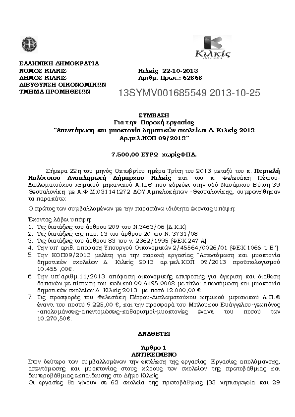 7. Παροχή εργασίας ¨Απεντόμωση και μυοκτονία δημοτικών σχολείων Δ. Κιλκίς 2013 Αρ.μελ.ΚΟΠ 09/2013¨