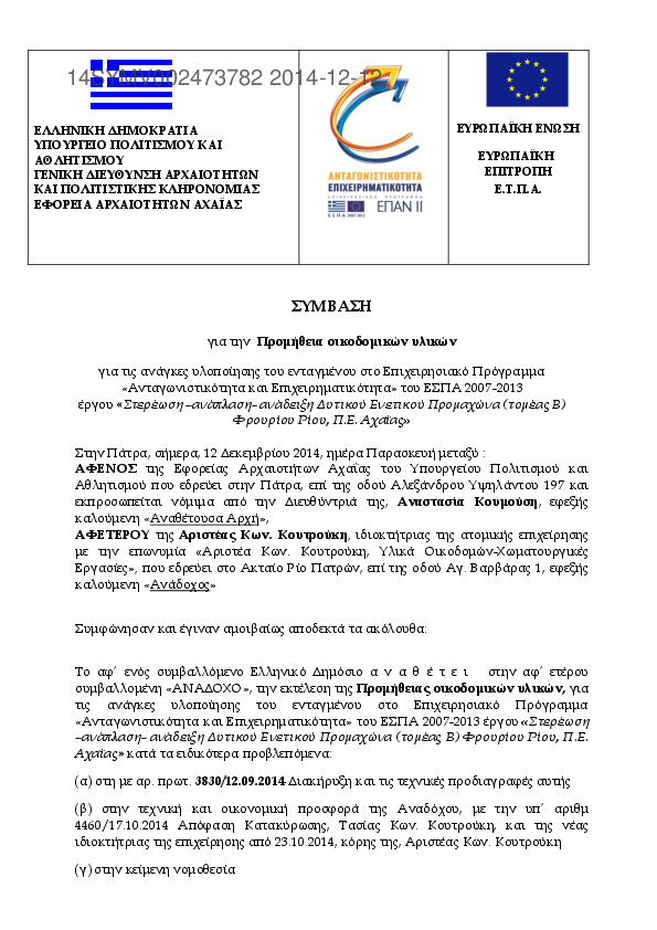 2. ΣΥΜΒΑΣΗ ΓΙΑ ΤΗΝ ΠΡΟΜΗΘΕΙΑ ΟΙΚΟΔΟΜΙΚΩΝ ΥΛΙΚΩΝ ΓΙΑ ΤΙΣ ΑΝΑΓΚΕΣ ΥΛΟΠΟΙΗΣΗΣ ΤΟΥ ΕΝΤΑΓΜΕΝΟΥ ΣΤΟ ΕΠΙΧΕ