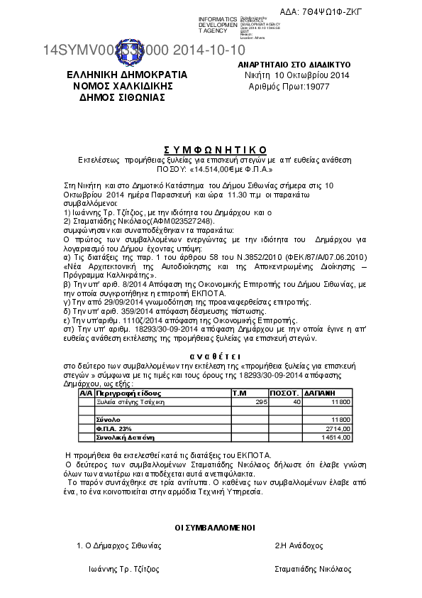 1. Συμφωνητικό για προμήθεια ξυλείας για επισκευή στεγών