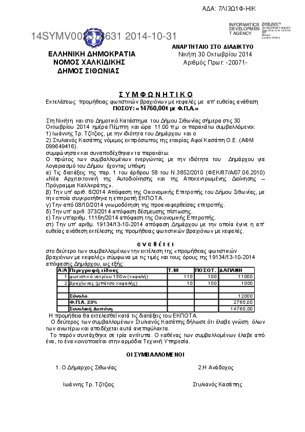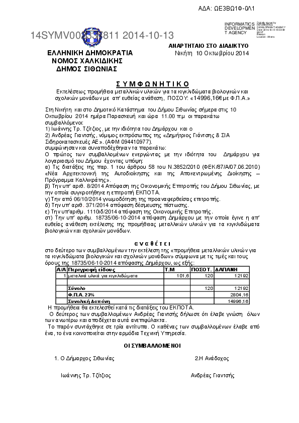 3. Συμφωνητικό για προμήθεια μεταλλικών υλικών για τα κιγκλιδώματα βιολογικών και σχολικών μονάδων