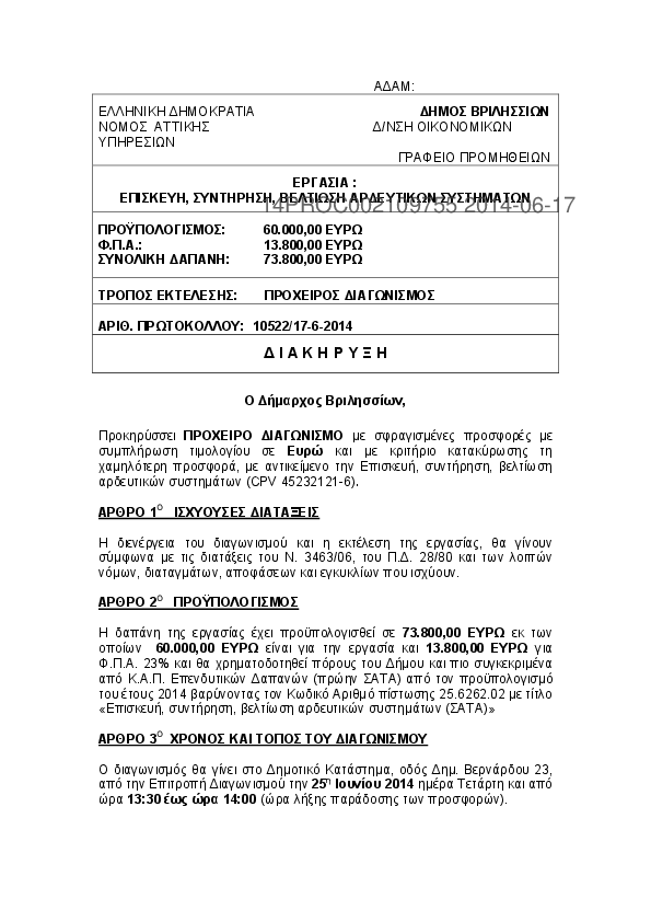 3. ΔΙΑΚΗΡΥΞΗ ΠΡΟΧΕΙΡΟΥ ΔΙΑΓΩΝΙΣΜΟΥ ΓΙΑ ΤΗΝ ΕΚΤΕΛΕΣΗ ΤΗΣ ΕΡΓΑΣΙΑΣ "ΕΠΙΣΚΕΥΗ, ΣΥΝΤΗΡΗΣΗ, ΒΕΛΤΙΩΣΗ ΑΡΔΕΥΤΙ