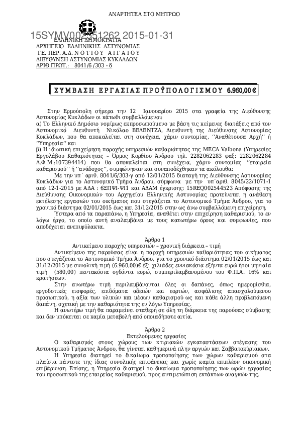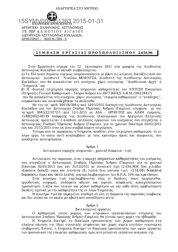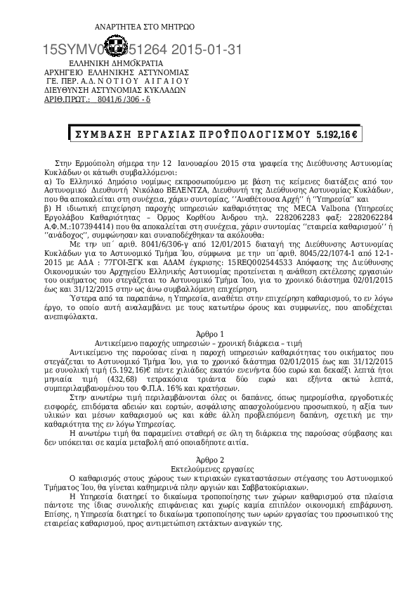 10. Σύμβαση για τον καθαρισμό από ιδιωτ συνεργείο των χώρων του Αστυνομικού Μεγάρου Κυκλάδων το 2015