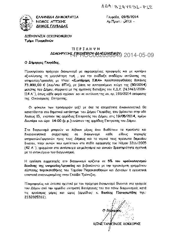 9. ΠΕΡΙΛΗΨΗ ΔΙΑΚΗΡΥΞΗΣ ΠΡΟΧΕΙΡΟΥ ΔΙΑΓΩΝΙΣΜΟΥ ΓΙΑ ΣΥΝΤΗΡΗΣΗ ΣΜΑ
