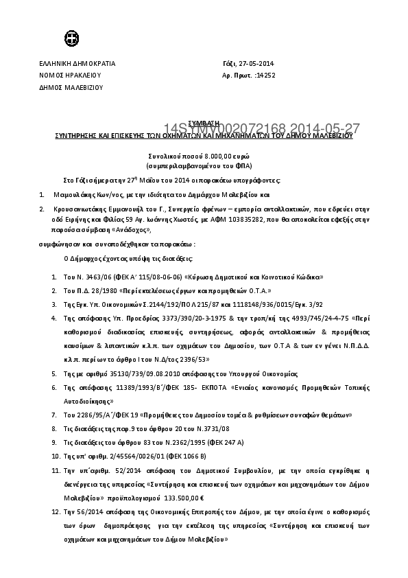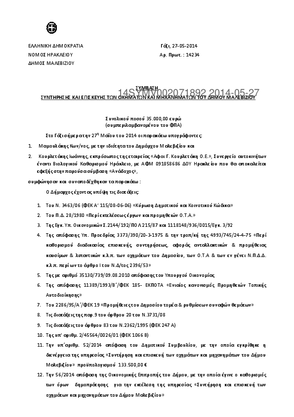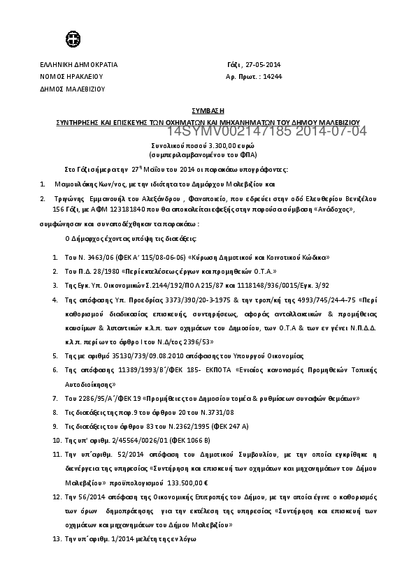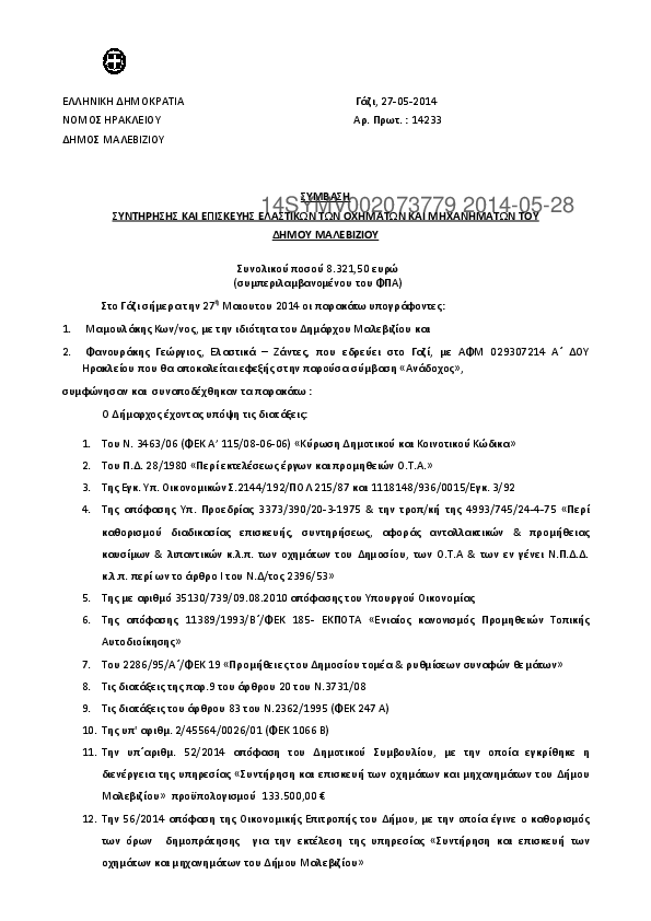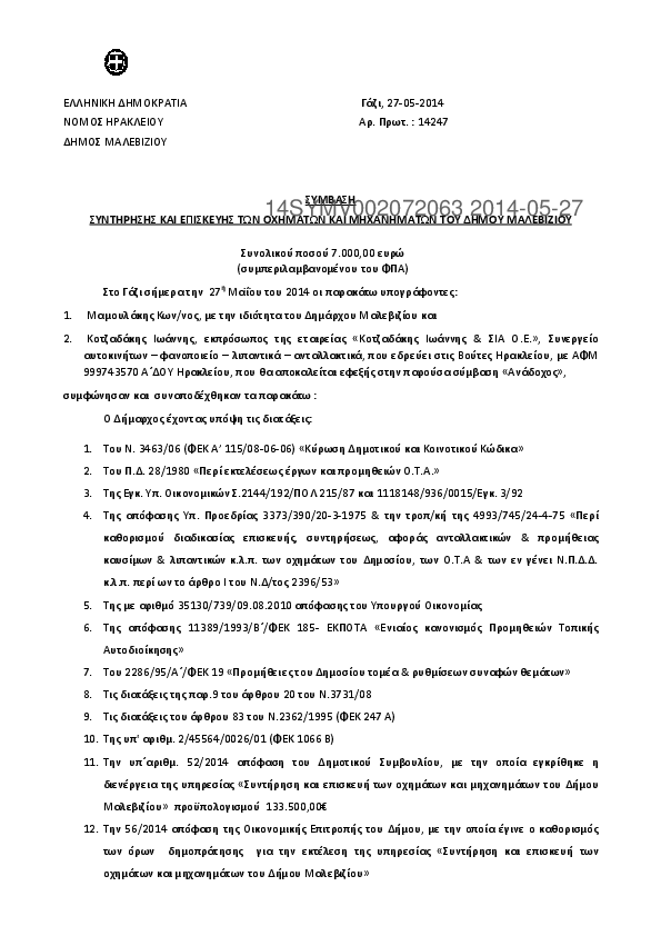 1. Σύμβαση για την συντήρηση και επισκευή των οχημάτων και μηχανημάτων του Δήμου Μαλεβιζίου