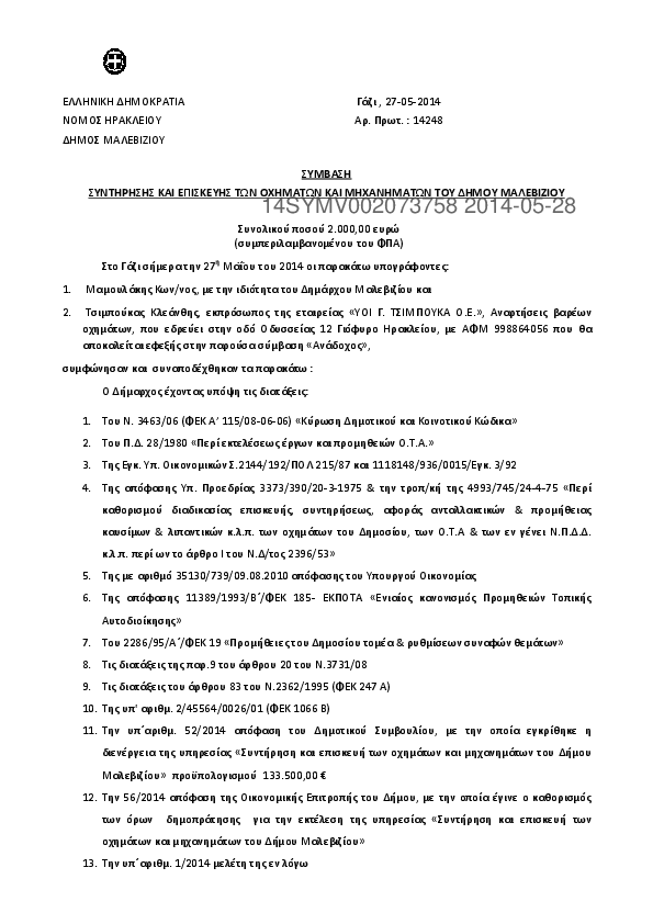 2. Σύμβαση για την συντήρηση και επισκευή των οχημάτων και μηχανημάτων του Δήμου Μαλεβιζίου