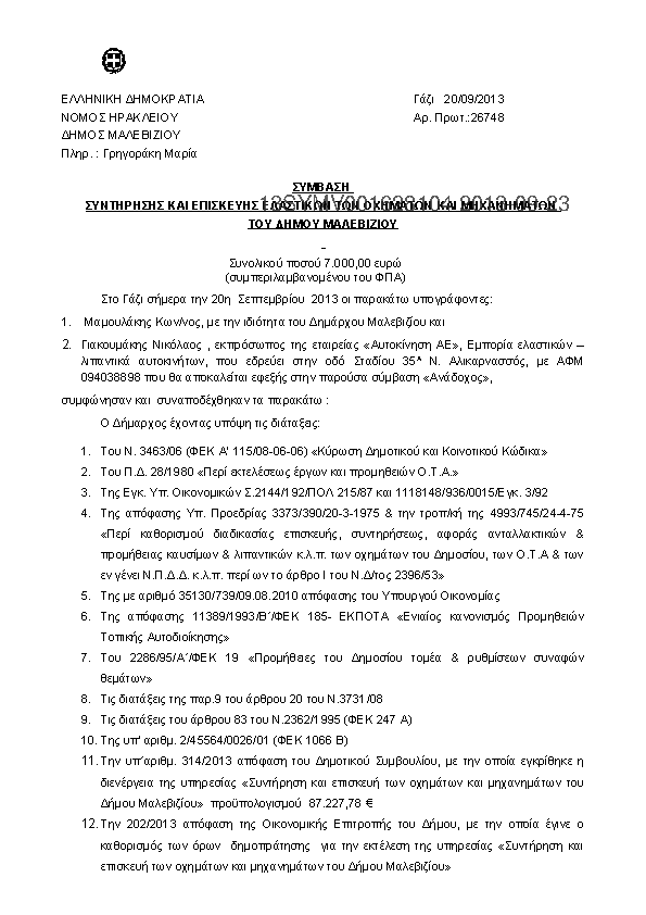 5. ΣΥΜΒΑΣΗ ΣΥΝΤΉΡΗΣΗΣ ΚΑΙ ΕΠΙΣΚΕΥΗΣ ΤΩΝ ΟΧΗΜΑΤΩΝ ΚΑΙ ΜΗΧΑΝΗΜΑΤΩΝ ΤΟΥ ΔΗΜΟΥ ΜΑΛΕΒΙΖΙΟΥ