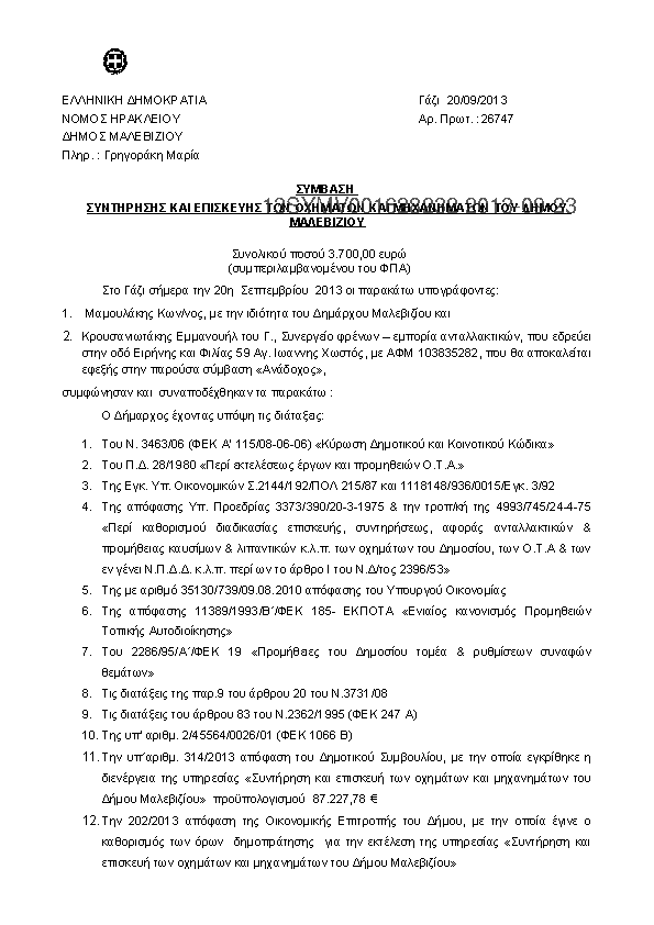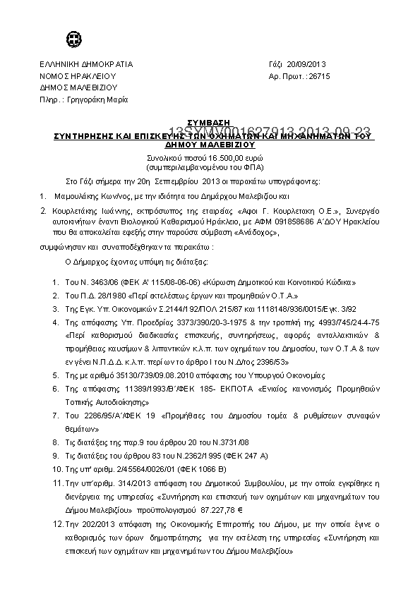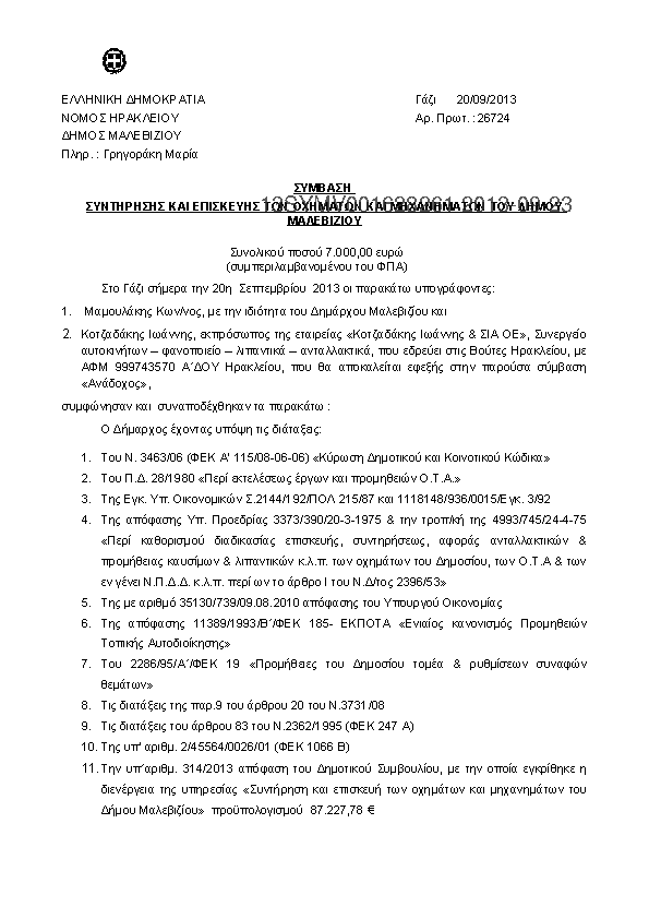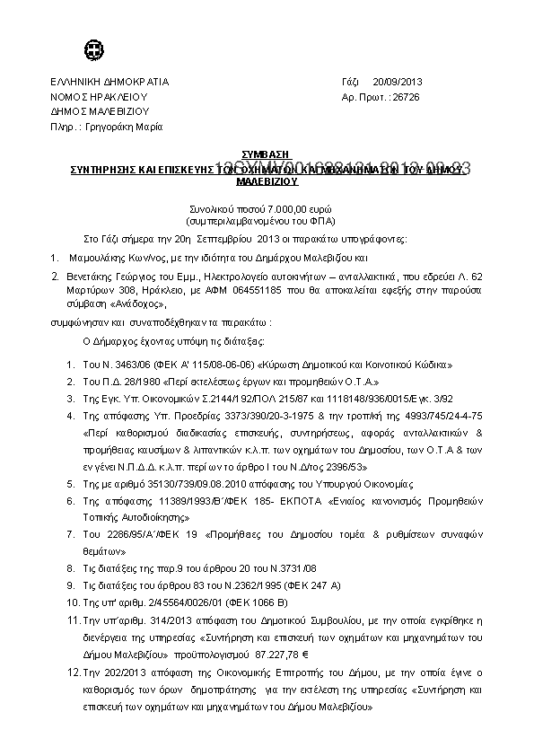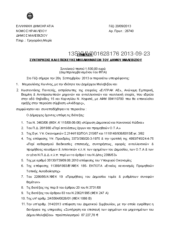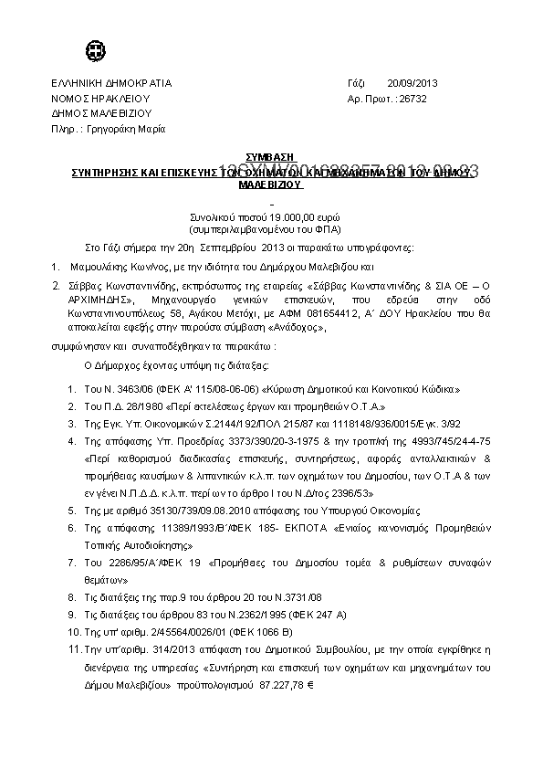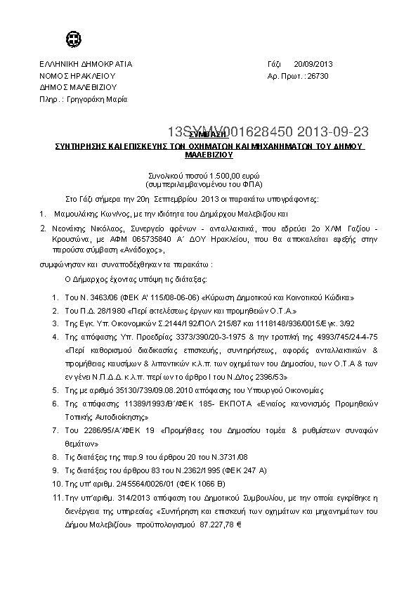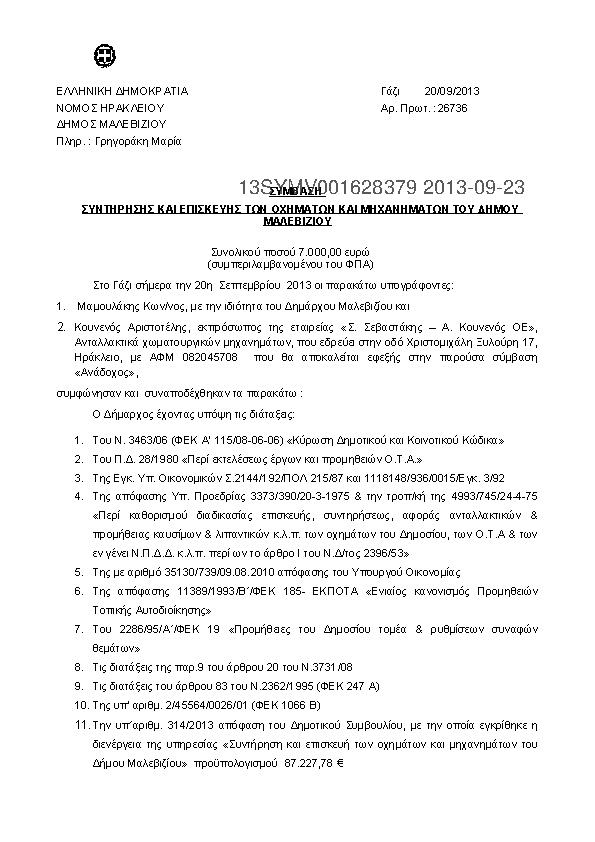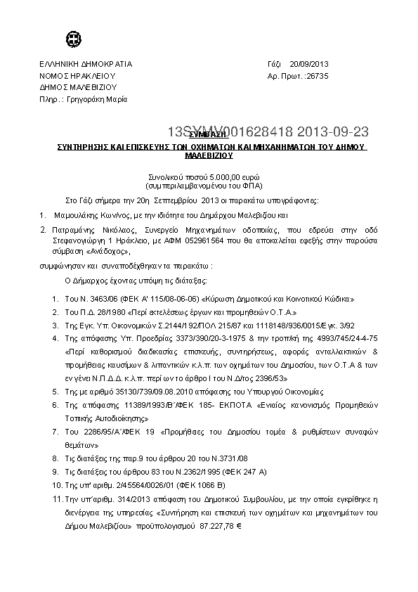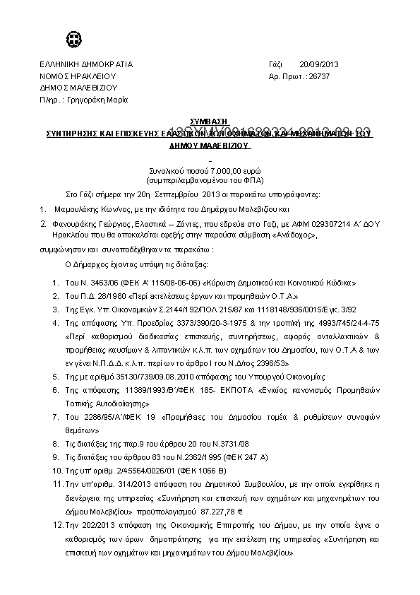 5. ΣΥΜΒΑΣΗ ΣΥΝΤΉΡΗΣΗΣ ΚΑΙ ΕΠΙΣΚΕΥΗΣ ΤΩΝ ΟΧΗΜΑΤΩΝ ΚΑΙ ΜΗΧΑΝΗΜΑΤΩΝ ΤΟΥ ΔΗΜΟΥ ΜΑΛΕΒΙΖΙΟΥ