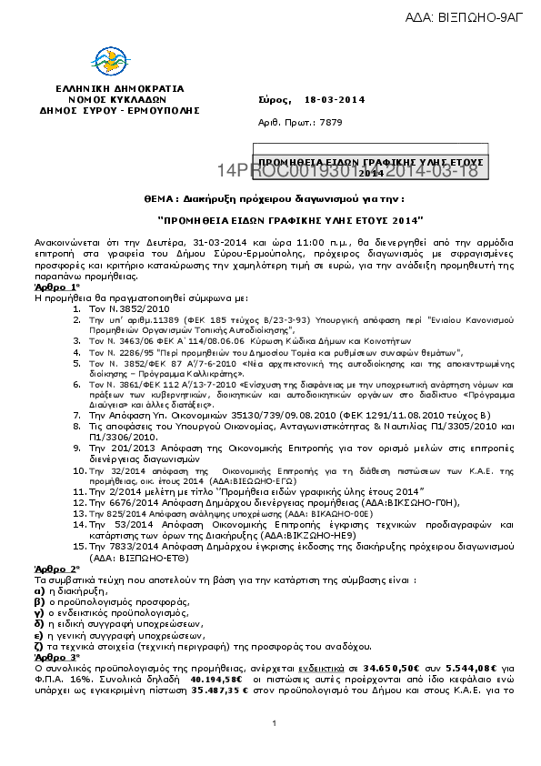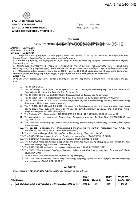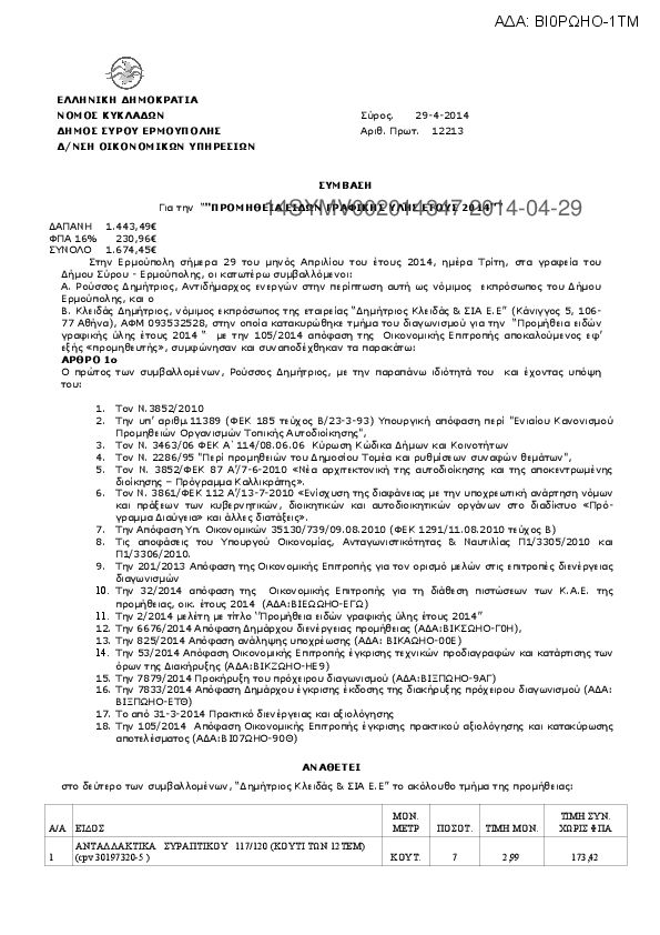 10. Σύμβαση για την προμήθεια ειδών γραφικής ύλης έτους 2014.