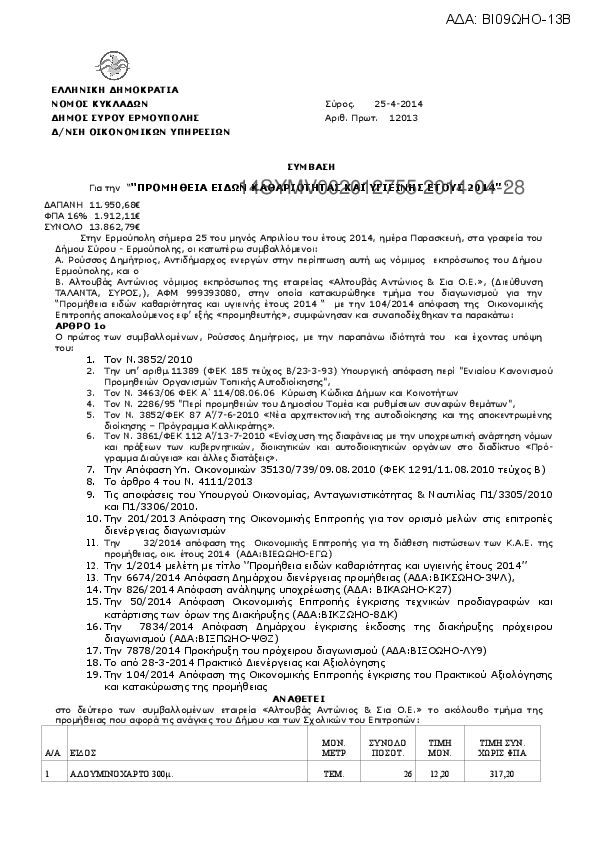 7. Σύμβαση για την προμήθεια ειδών καθαριότητας και υγιεινής έτους 2014.