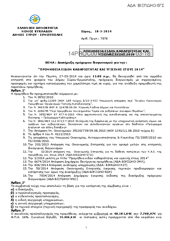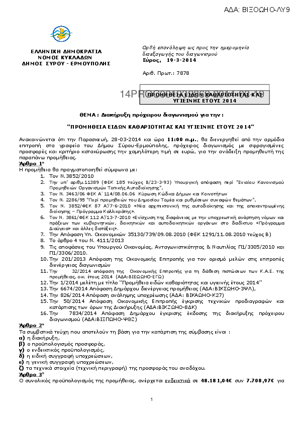 3. Διακήρυξη για την προμήθεια ειδών καθαριότητας και υγιεινής έτους 2014