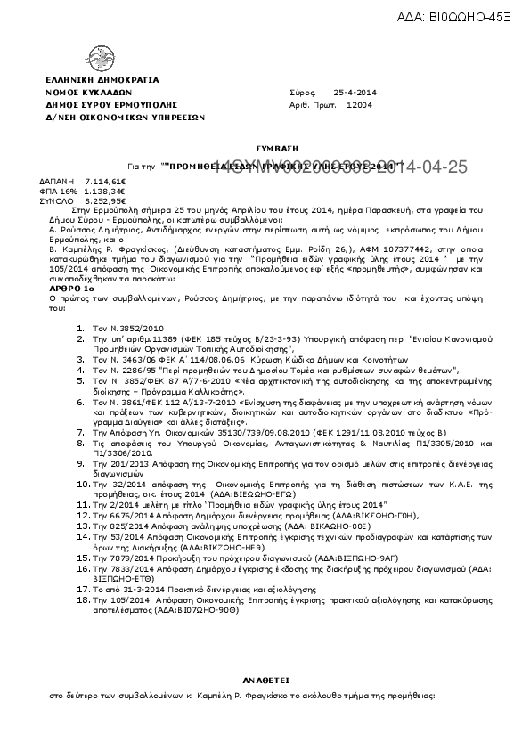 8. Σύμβαση για την προμήθεια ειδών γραφικής ύλης έτους 2014.