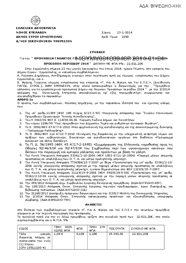 2. ΣΥΜΒΑΣΗ ΠΡΟΜΗΘΕΙΑΣ ΓΑΛΑΚΤΟΣ ΓΙΑ ΤΟ ΕΡΓΑΤΟΤΕΧΝΙΚΟ ΠΡΟΣΩΠΙΚΟ ΔΗΜΟΥ ΚΑΙ ΝΟΜΙΚΩΝ ΠΡΟΣΩΠΩΝ ΠΕΡΙΟΔΟΥ 2014